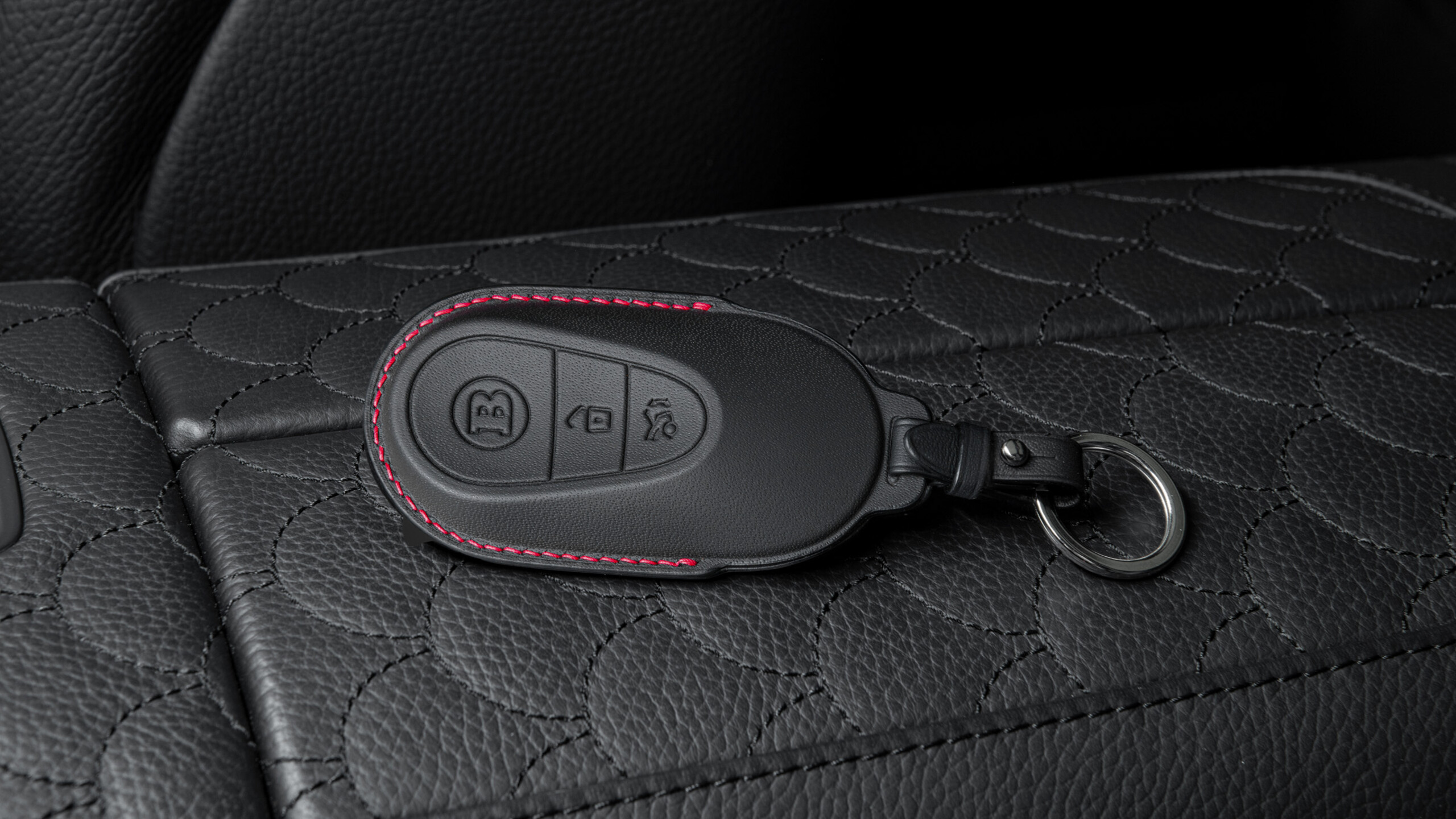 Protect your key with this custom BRABUS key cover. Made from high-grade leather and accentuated by matching red stitching, this must-have accessory features unmistakable “B” embossing on the front side and BRABUS lettering on the back.