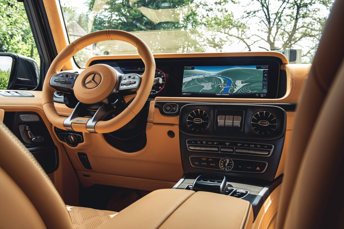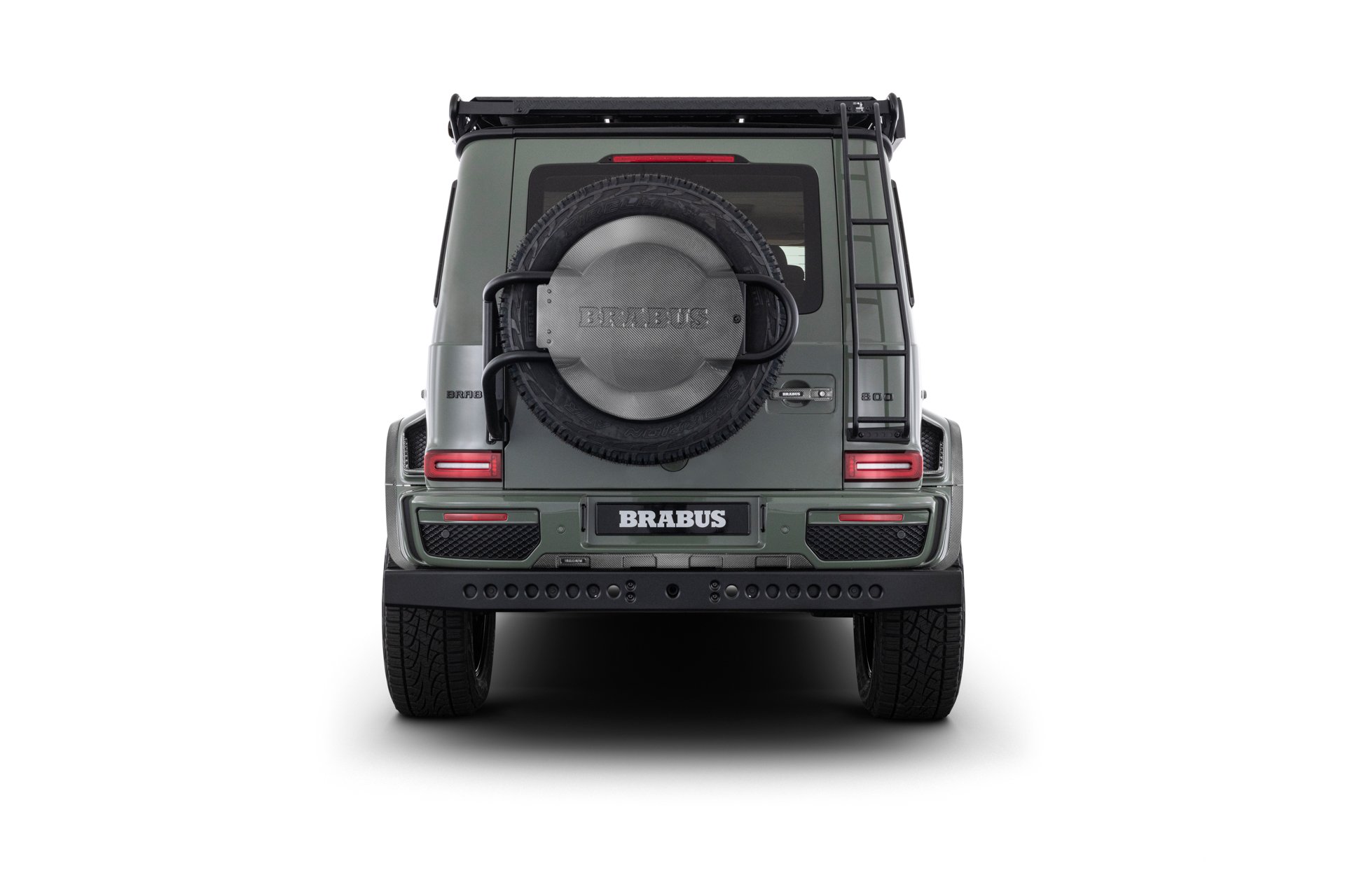 Further features of the BRABUS Adventure package include the BRABUS wind deflector, offering bold looks and excellent visibility by night, the BRABUS roof rack with side mounted survival utilities, the BRABUS rear-ladder for easier loading and unloading – as well as a custom BRABUS rear fascia, likewise complete with integrated carbon fiber underride guard. High-gloss sealed carbon fiber cladding the door handles as well as the trim for the spare wheel cover round off the BRABUS 800 4x4² Stealth Green’s thrilling looks.