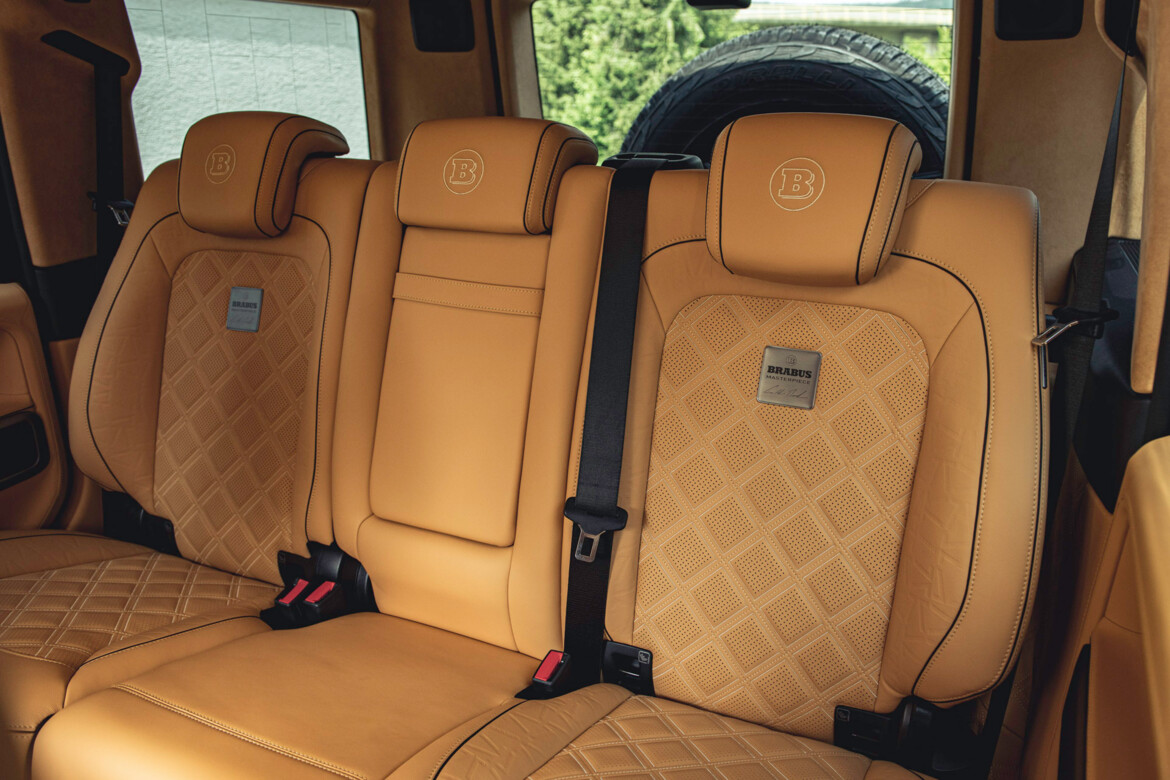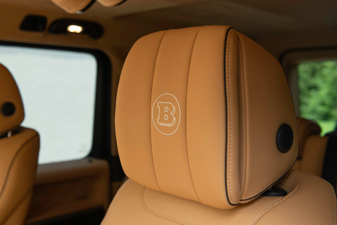 Beyond its breathtaking power, the BRABUS 800 4x4² Stealth Green exudes the highest attainable level of bespoke interior luxury. Designed to capture the essence of the wild and provide an unmistakable contrast to its Stealth Green DNA, the Geländewagen features an exclusive BRABUS Masterpiece interior – handcrafted to impeccable perfection at the BRABUS saddlery by our team of highly skilled specialists. A particularly soft and breathable leather in BRABUS “Sunrise” was implemented throughout the entire cabin, seamlessly blending in with the Dinamica microfiber headliner. Elegant white stitching working in concert with black piping tastefully underscores the “Double-Cube” quilting pattern – applied with impeccable precision on the seats and door panels. For a touch of heritage, the BRABUS “Heritage” brand pattern, which pays tribute to our founding year 1977 with its embossed “77” signets, was applied to several sections of the cockpit, including the center console and sun visors.