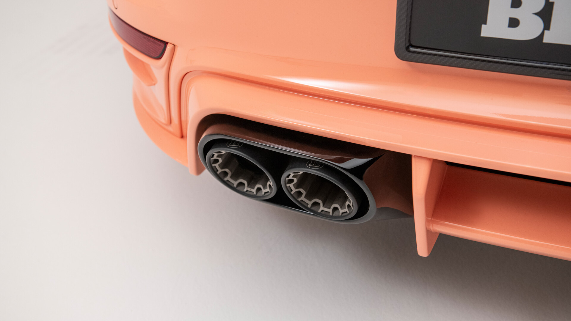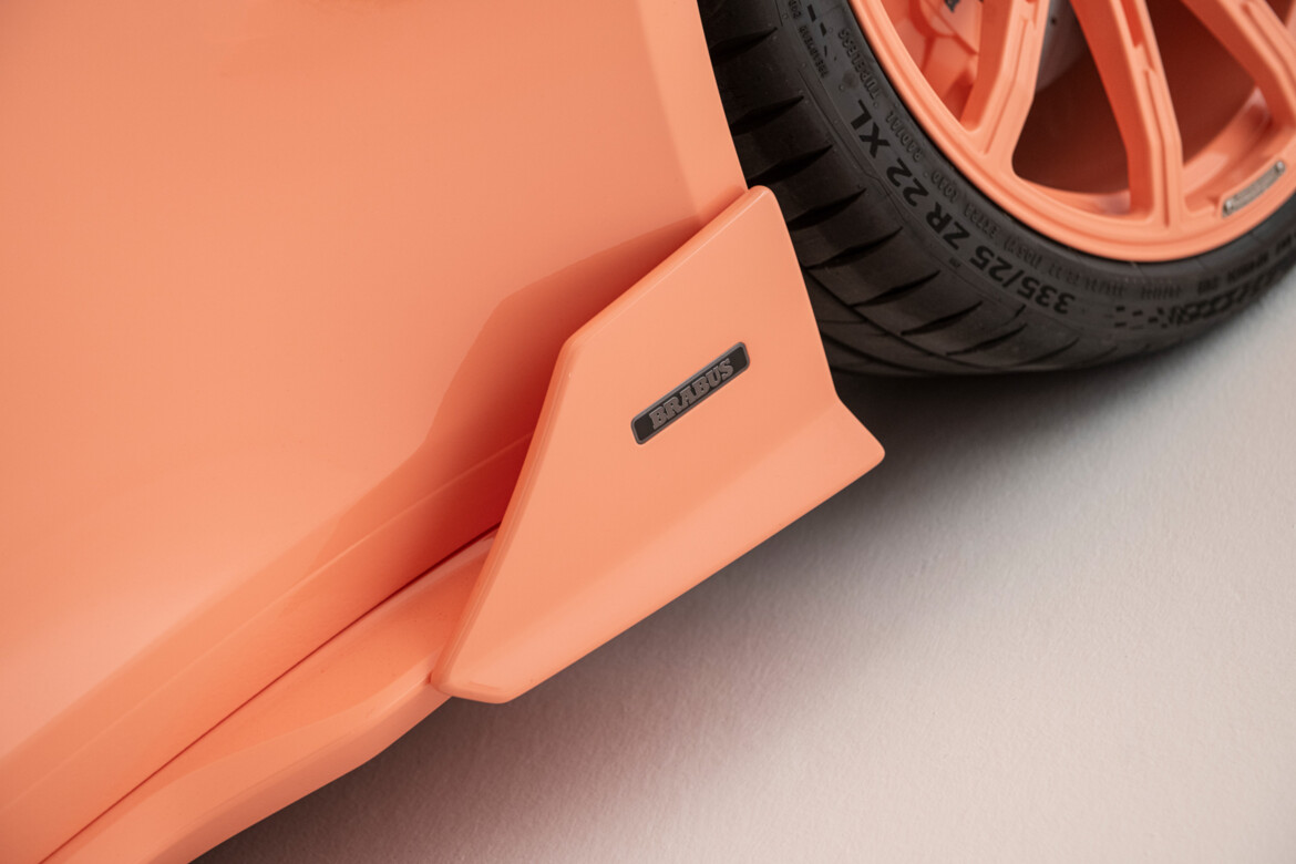 Accentuating the supercar’s undeniably sporty chassis is a selection of BRABUS typical carbon components that emphasize its dynamic appeal. These include the BRABUS front fascia insert and the BRABUS front spoiler with distinctive side flaps on each side. Additional carbon side flaps mounted just in front of the rear wheels perfectly match the design and define the supercar's distinctive shape. Boasting the same “Peetch” finish, each of these components creates an extraordinary, cohesive look that perfectly complements the car’s powerful signature character. At the back, the BRABUS rear wing and the BRABUS diffuser—likewise finished in bodycolor—perfectly round off the design and optimize lift at high speeds while delivering an unmistakable motorsports flair.