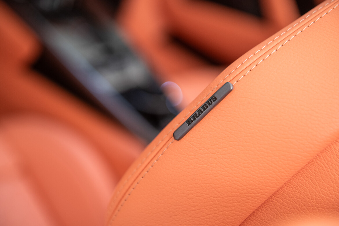 The interplay between the rich leather and carbon elements across the center console, steering wheel and dashboard highlights the fusion of luxury and performance. In keeping with the BRABUS DNA, these high-performance carbon fiber details are complemented by sleek aluminum components like the BRABUS pedals and a footrest with backlit BRABUS logo. Further enhancing the cockpit’s aesthetic are the interior trim elements, finished in BRABUS "Shadow Gray," providing a subtle contrast to the striking “Peetch” leather, as well as carbon entry panels with illuminated BRABUS logo.
