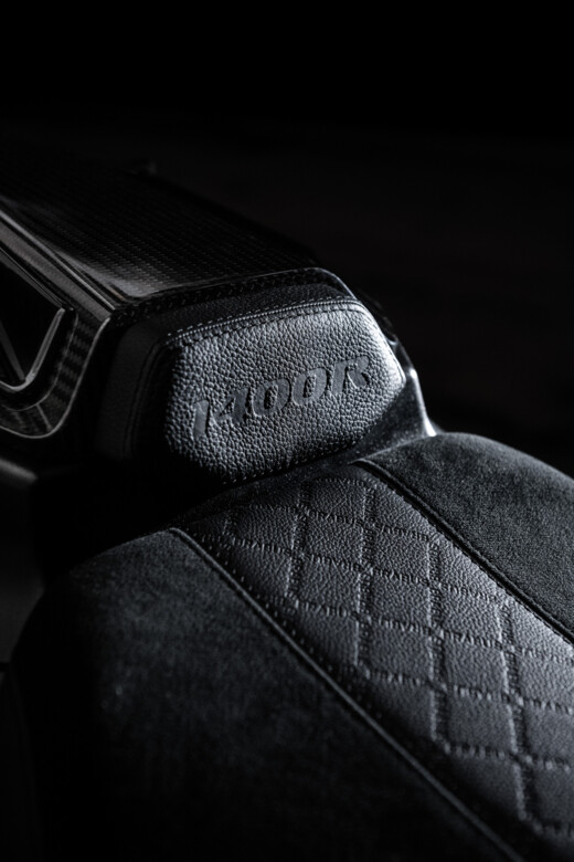 The bespoke rider’s seat was meticulously handcrafted from a brand-typical combination of BRABUS Masterpiece leather and Dinamica microfiber. Embossed BRABUS logos in the center of the seat complete the exclusive design. Form-optimized side winglets behind the leather backrest upholstery accentuate the aerodynamics of the bike at the rear.