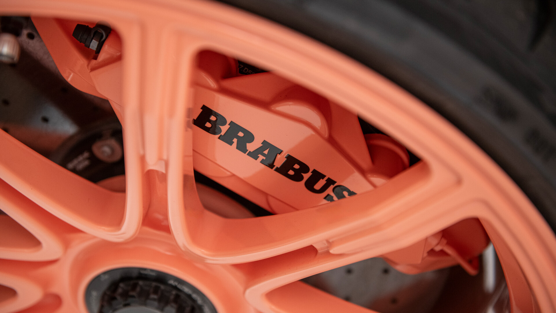 The unmistakable wow factor of the BRABUS 900 "PEETCH" is further amplified by its exclusive 22/21-inch BRABUS Monoblock Z "PLATINUM EDITION" high-end wheels. This hallmark wheel design was created through the use of state-of-the-art forging technology and, like the rest of the supercar, finished entirely in the BRABUS “Peetch” signature hue. Their lightweight construction enhances both stability and performance, contributing to the two-door’s razor-sharp handling. Adding a subtle yet striking detail, the center lock is finished in black, creating a powerful contrast.