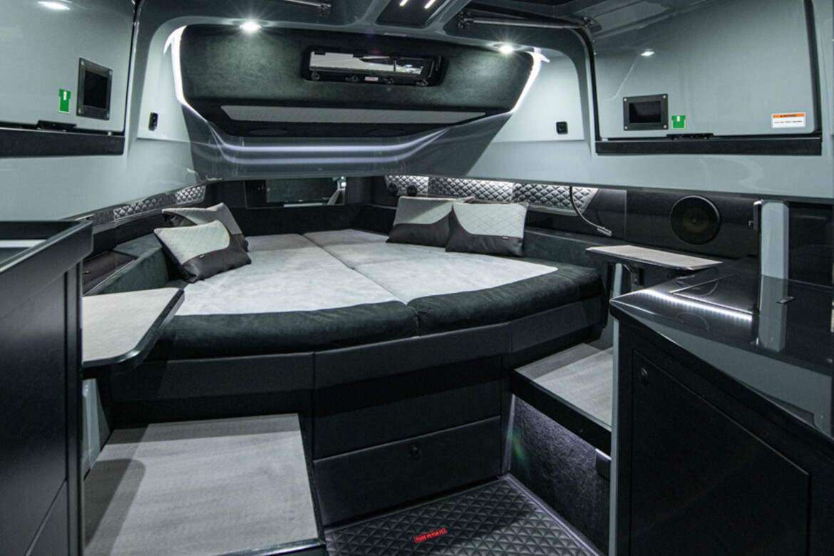 | Front lounge and optional aft-cabin in exclusive BRABUS Masterpiece leather in light gray/black color scheme with red accents or BRABUS Masterpiece leather light gray color scheme, and mattress in gray/black square pattern |