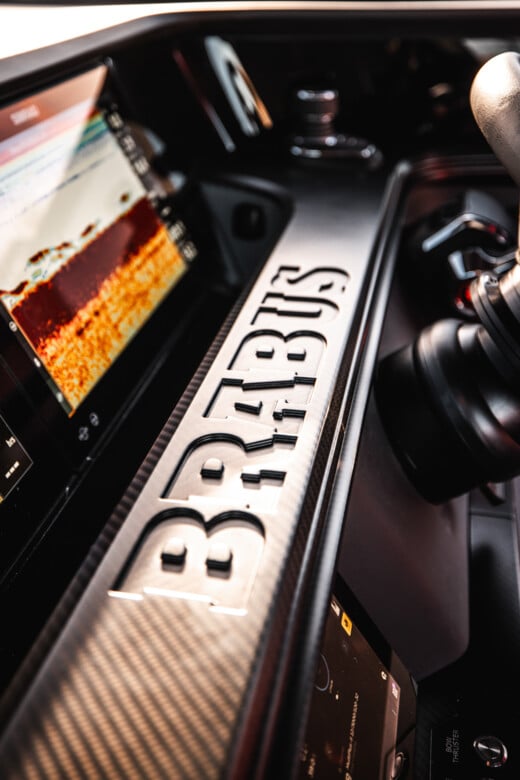 | Opional Extended BRABUS Navigation package: - extended glass bridge/ information display with two additional 7” screens, - On-board connectivity and 4G wifi router, - VHF unit with AIS receiver and Simrad Halo20+ radar, - 5-inch touch display in front lounge, - BRABUS Lock Box and additional BRABUS roof instruments | |