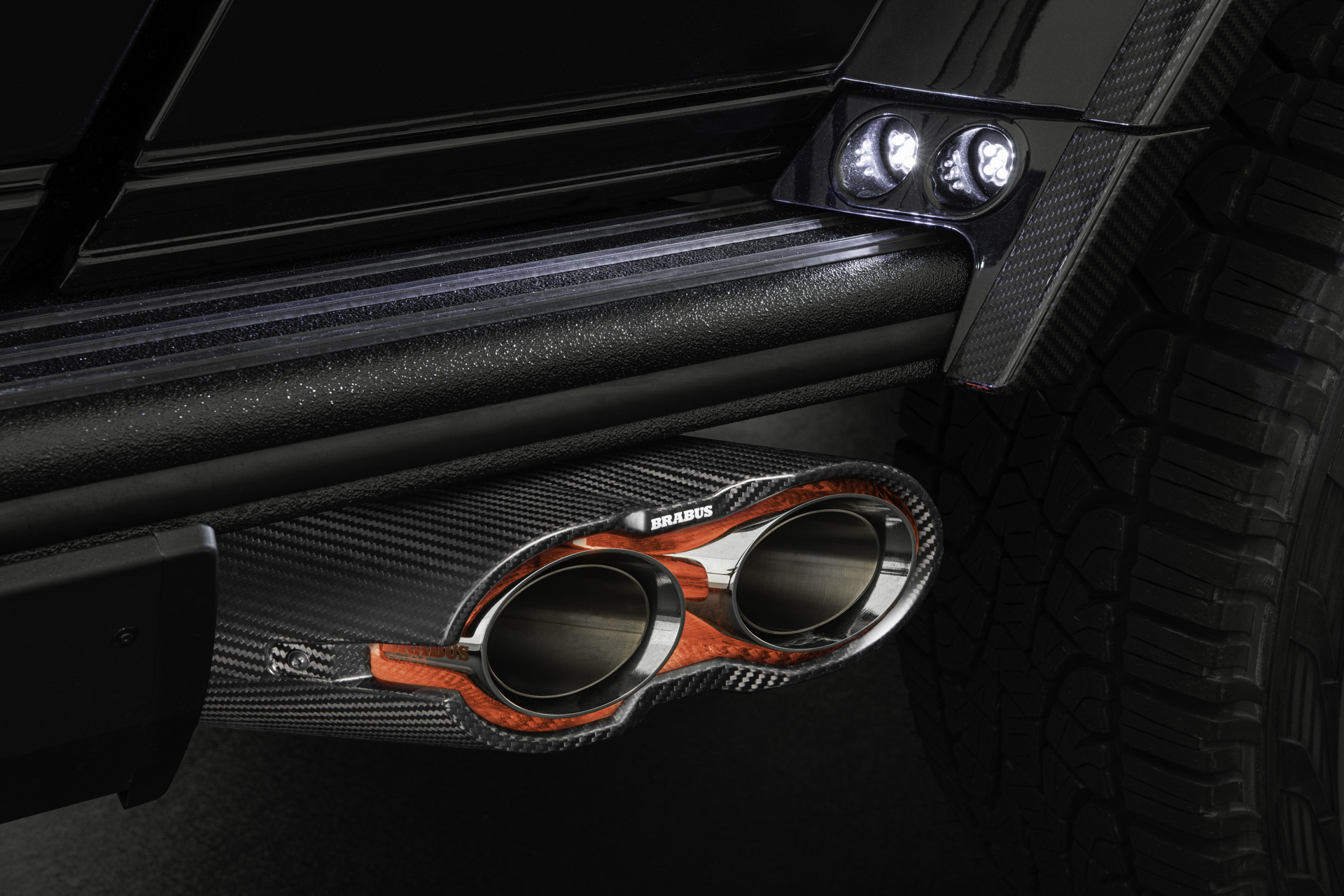 The carbon fiber BRABUS WIDESTAR fenders are fitted with integrated LED lights that perfectly illuminate the running boards. The entry lights are activated together with the BRABUS logo in the design components behind the front fenders and the underbody lights when a door handle is pulled or the central locking system is operated via Keyless Go when approaching the vehicle. In the rear, a carbon element on the tailgate with recessed BRABUS logotype and the BRABUS rear fascia, likewise fitted with a carbon skid plate, round off the look.
