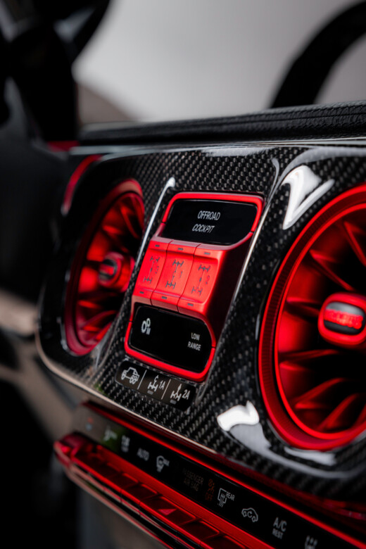 The driving experience is further amplified by the BRABUS stainless-steel high-performance sports exhaust system, complete with actively controlled butterfly valves. Switch between a discrete whisper or the unrestrained, full-throttle sound of the V8 powertrain. The two side-exit tailpipes on either side of the vehicle are framed by exposed-structure carbon fiber surrounds with integrated red illumination for another unmistakable visual accent.
