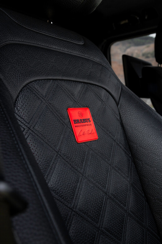 Inside the BRABUS XLP 800 6x6 ADVENTURE, attention to detail takes center stage. Tailored in perfect harmony with the vehicle’s exterior, the cockpit and rear cabin are covered in the finest black leather. Every contour reflects absolute precision—from the meticulously stitched BRABUS “Dual Cube” quilting on the seat surfaces to the perfectly aligned perforations that ensure seamless integration of seat climate control. This signature pattern extends to the inner door panels, sun visors and the leather-trimmed center strip of the Dinamica microfiber headliner, creating a visual and tactile Masterpiece design.