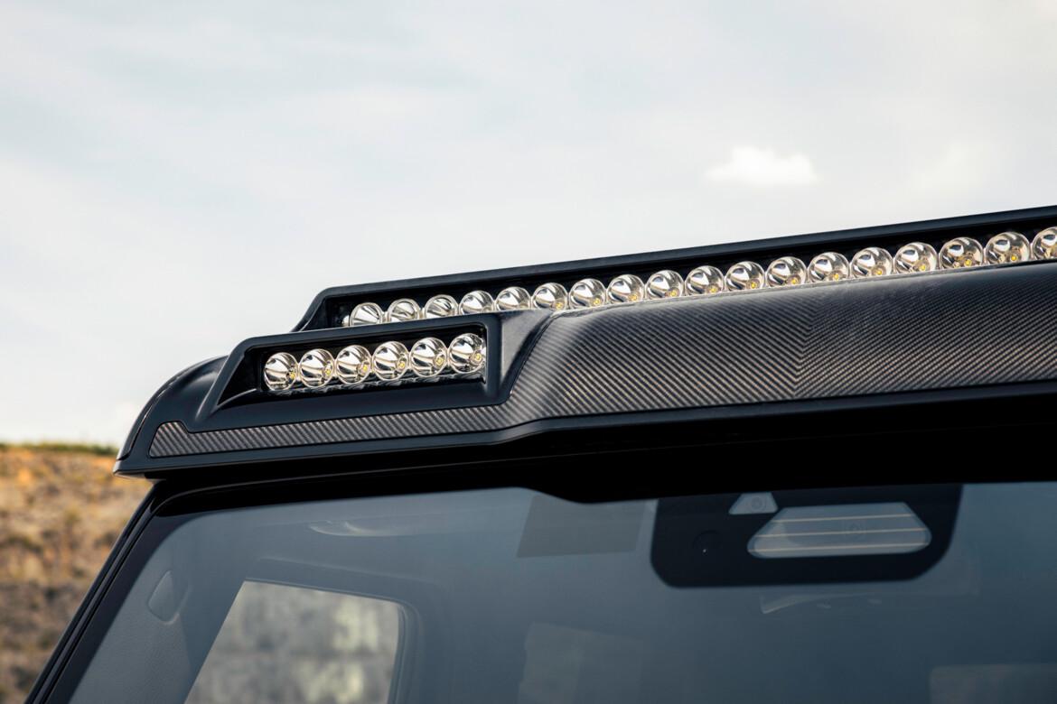 From every angle, the XLP 800 6x6 is an absolute showstopper. The bold BRABUS front fascia features a carbon-fiber radiator grille surround and a skid-plate-style lower element concealing a heavy-duty winch capable of pulling up to 4,500 kilograms (9,920 lbs). The carbon fiber BRABUS power dome hood and wind deflector above the windshield guide airflow toward the full-length Adventure roof rack, where three integrated LED light bars illuminate the terrain in front of the vehicle by night.