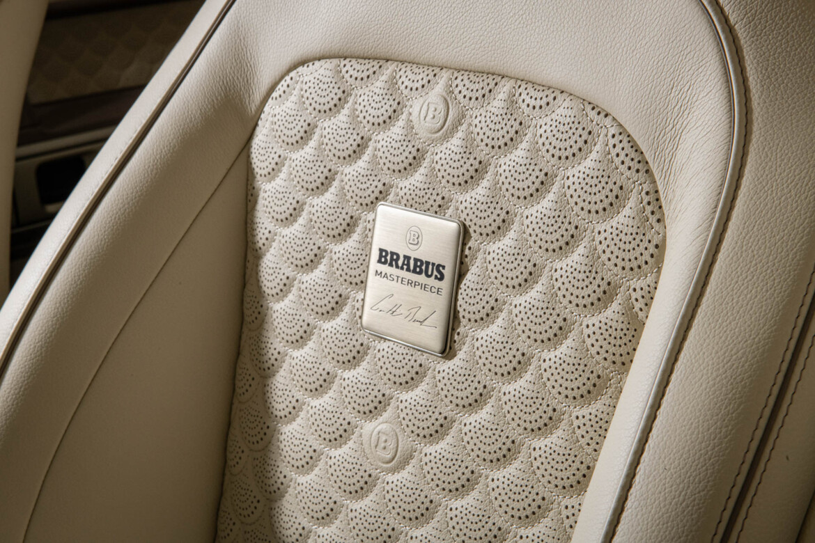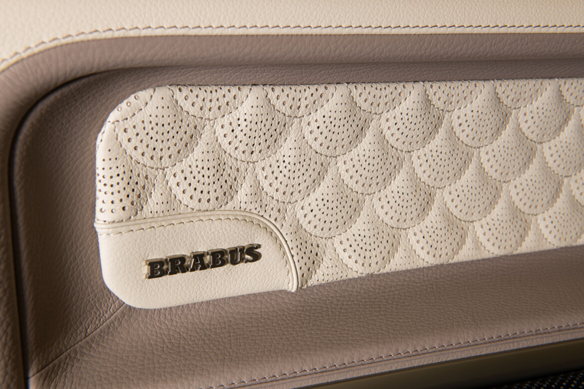 BRABUS Masterpiece style ATELIER FUSION in color OXFORD SAND with Shell-quilting with embossed BRABUS logo. Piping and seams also in OXFORD SAND